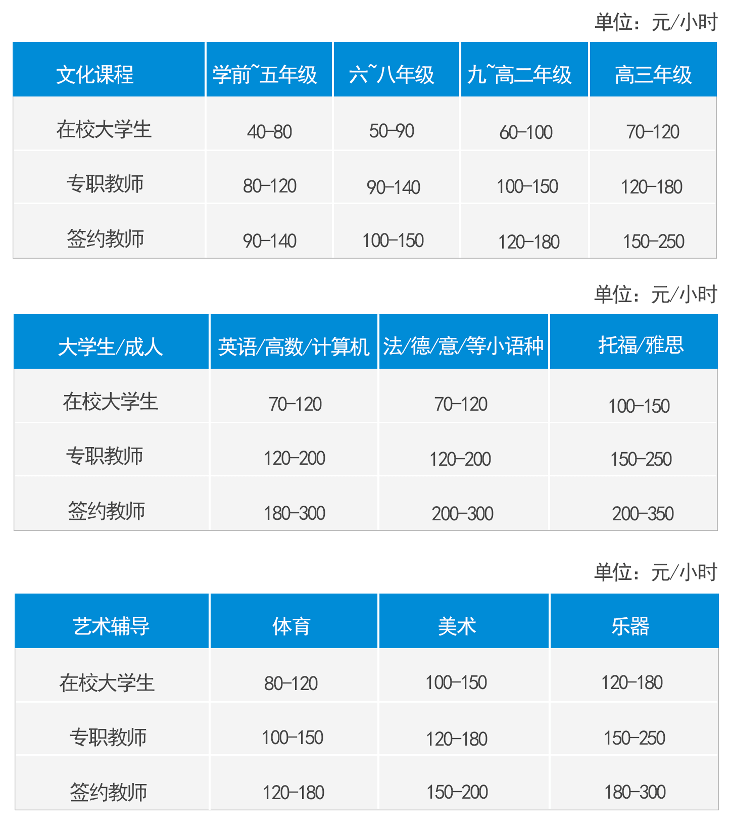 注:以上是1小时的课时费收费标准、授课时间皆为每次2小时起。